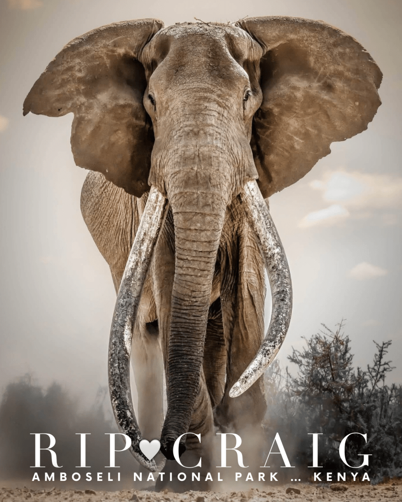 Craig was an Amboseli National Park legend, one of Africa’s last great super tuskers, and one of the most photographed elephants in the world. He was known world-wide for his magnificent, ground-sweeping tusks, and calm, majestic presence, and lived a long, protected life before passing away of natural causes today. His legacy will live on through his calves, beloved caretakers, all who were lucky enough to witness him in person, and everyone else like me who had the privilege of getting to know him through social media.