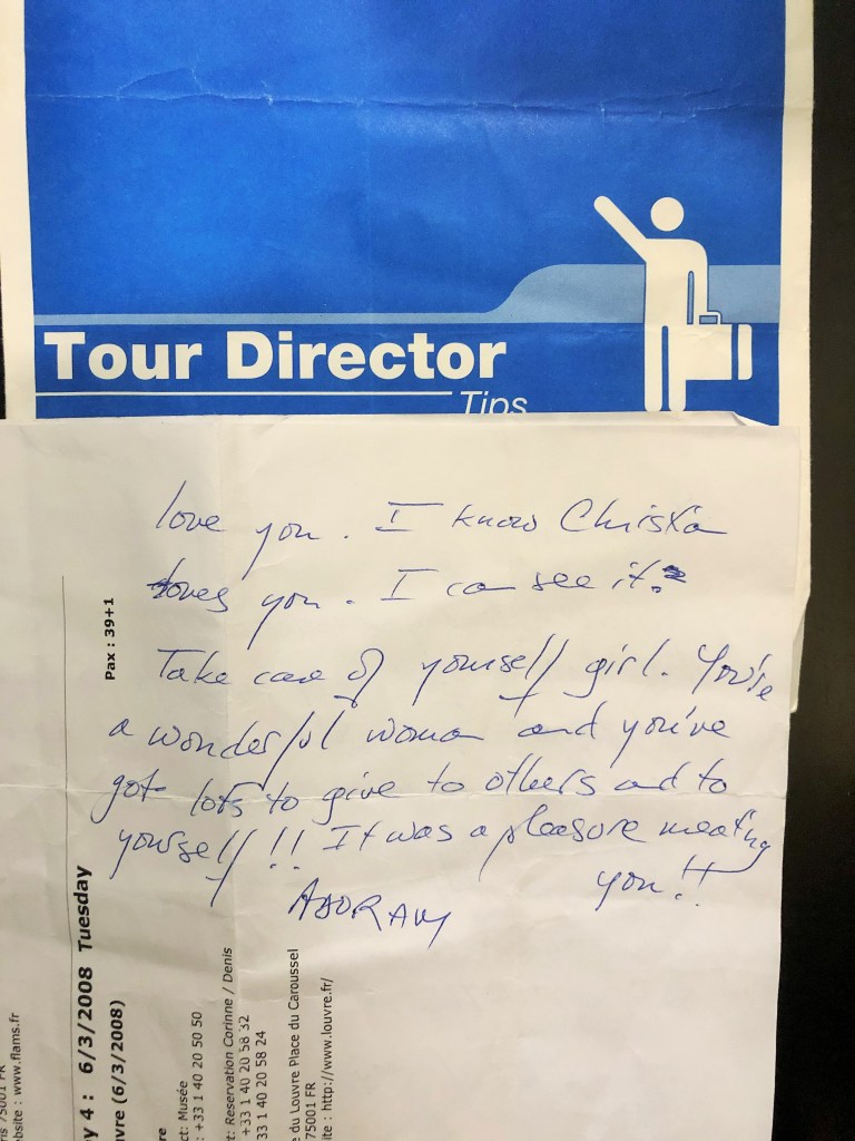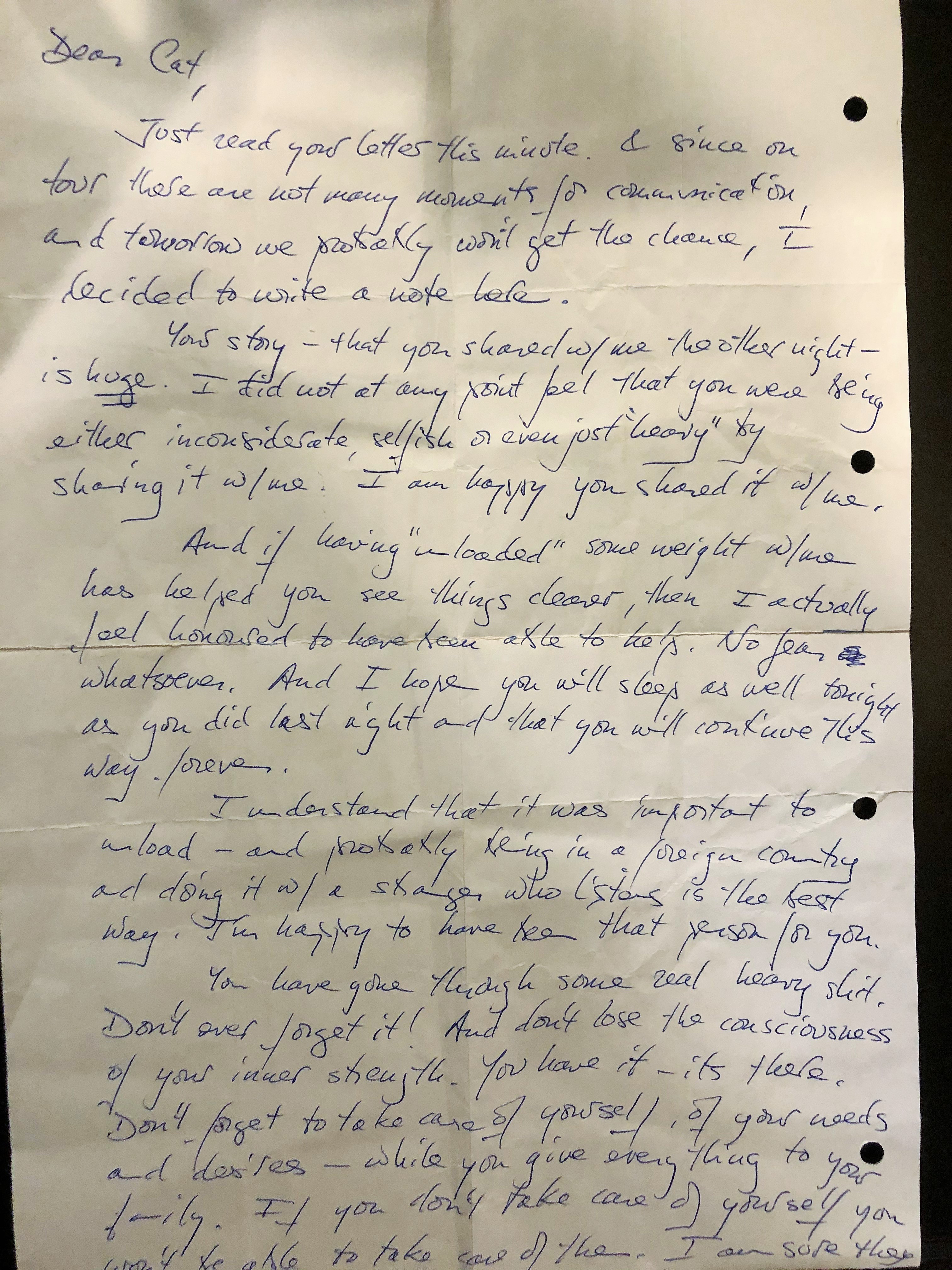 Since on tour there are not many moments for communication, and tomorrow we probably won’t get the chance, I decided to write you a note. Your story – that you shared with me last night – is huge. I did not at any point feel that you were being either inconsiderate, selfish or just “needy” by sharing it with me. And, if having “unloaded” some weight with me has helped you see things clearer, then I actually feel honored to have been able to help. No fears whatsoever. And I hope you will sleep as well tonight as you did last night and that you will continue this way forever. I understand that it was important to unload – and probably being in a foreign country and doing with a stranger who would listen was the best way. I’m happy to have been that person for you. You have gone through some real heavy shit. Don’t ever forget it! And, don’t lose to consciousness of your inner strength. You have it – it’s there! Don’t forget to take care of yourself – of your needs and desires – while you give everything you have to your family. If you don’t take care of yourself, you won’t be able to take care of them. I am sure they love and need you. I know Christian does. I can see it in his eyes and in the way that he looks at you. Take care of yourself girl! You’re a wonderful woman and you’ve got lots to give others and to yourself! It was a pleasure meeting you!