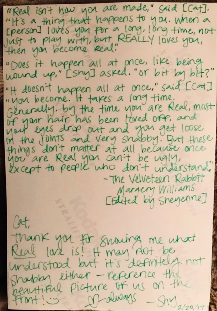 That moment you become a blubbering mess and thank GOD that you were lucky enough to bear certain crosses, because at the end of the day you may have lost some skin, but definitely ended up becoming real. And after all, isn’t “real” the only mark you want to touch the world with and the legacy you most want to leave for your children? “Please let me reach just one …”. I love you Sheyenne. To the Moon and back, always have, always will, and you will never NOT be one of “mine”. Thank you. Thank you. Thank you.