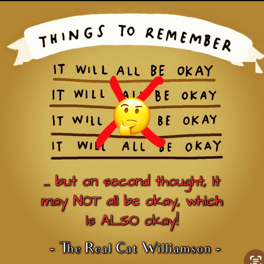 A seemingly “normalish“, 51yo woman sitting in bed singing along to a ridiculous music video, swaying back and forth and waving her fist in the air! (Lol. Yes, that really happened.) If you haven’t figured it out by now, much like the leader of this crazy Pride I’m in, I, too, am an oxymoron, and my Knucklehead card is one of my most powerful flexes. “The REAL Cat Williamson”: Loves people. Hates peopling. Loves Light. Hates dark. Loves love. Hates hate. Loves being broken. Loves being whole. Loves Jesus.