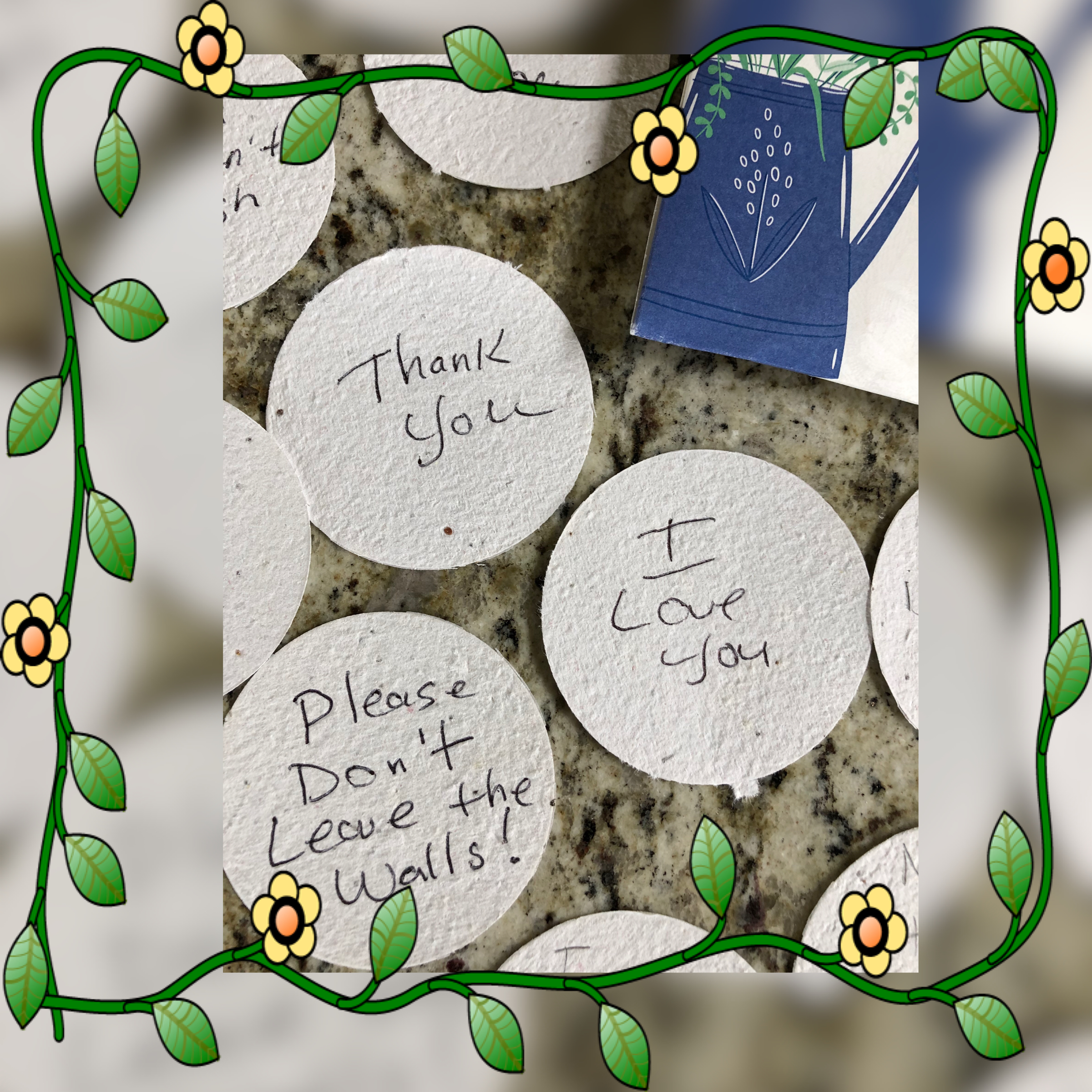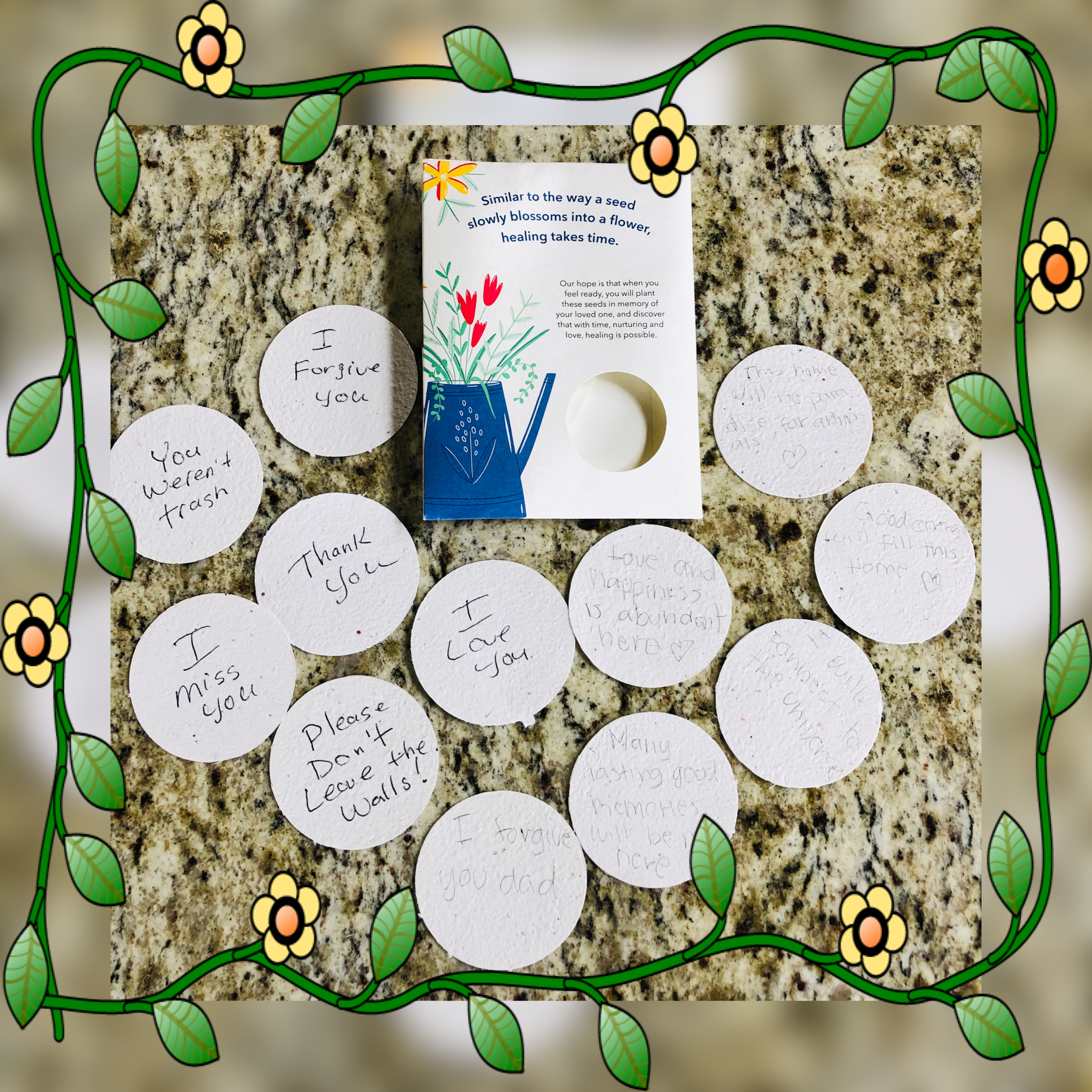 At the end of the day, each attendee received a packet of memorial “seedling” paper on which to write intentional messages of love, hope and perhaps even notes to our loved ones. I of course brought mine home, but because of the extremely complicated ways that he hurt her, Gia’s road to recovery was not only delicate, but, strictly on her timing. So, the packet just sat in our windowsill for months.