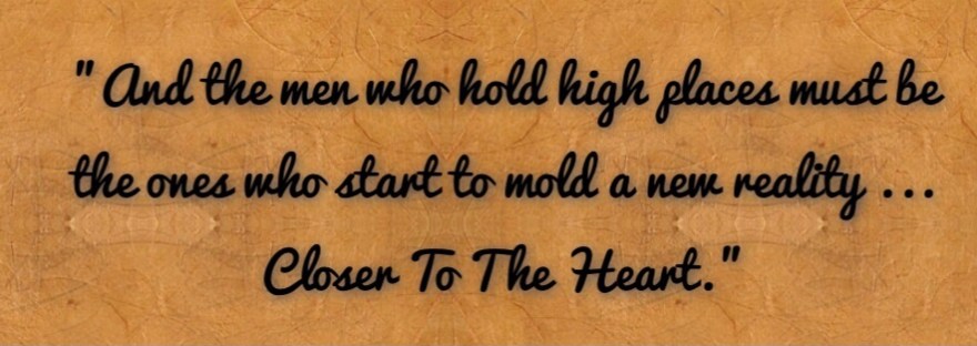 And the men who hold high places must be the ones who start to mold a new reality closer to the heart … The blacksmith and the artist reflect it in their art. They forge their creativity closer to the heart. Yes, closer to the heart … Philosophers and plowmen – each must know his part to sow a new mentality closer to the heart … You can be the captain and I will draw the chart sailing into destiny closer to the heart.
