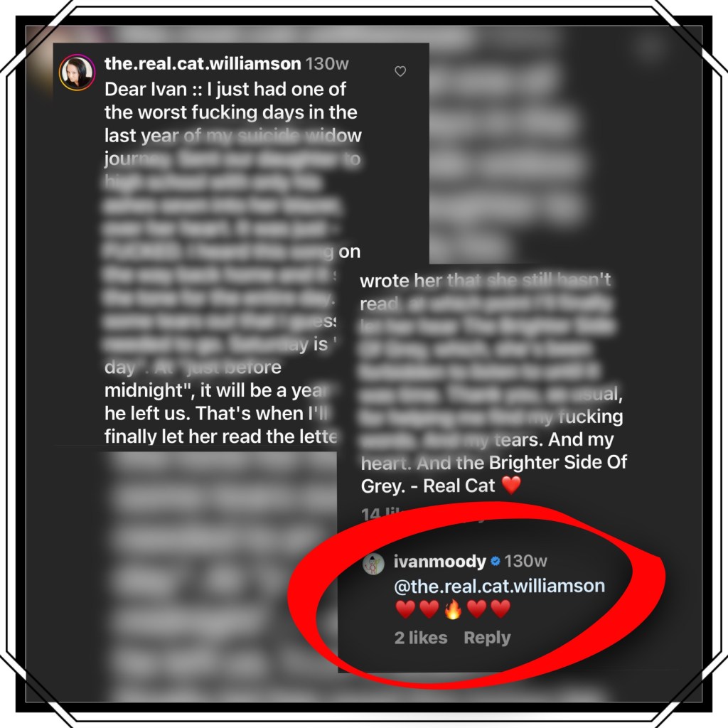 I just had one of the worst fucking days in the last year of my suicide widow journey. Sent our daughter to high school with only his ashes sewn into her blazer, over her heart. It was just – FUCKED. I heard this song on the way back home and it set the tone for the entire day. Got some tears out that I guess needed to go. Saturday is “the day”. At “just before midnight”, it will be a year that he left us. That’s when I’ll finally let her read the letter he wrote her that she still hasn’t read, at which point I’ll finally let her hear The Brighter Side Of Grey, which, she’s been forbidden to listen to until it was time. Thank you, as usual, for helping me find my fucking words. And my tears. And my heart. And the Brighter Side Of Grey.