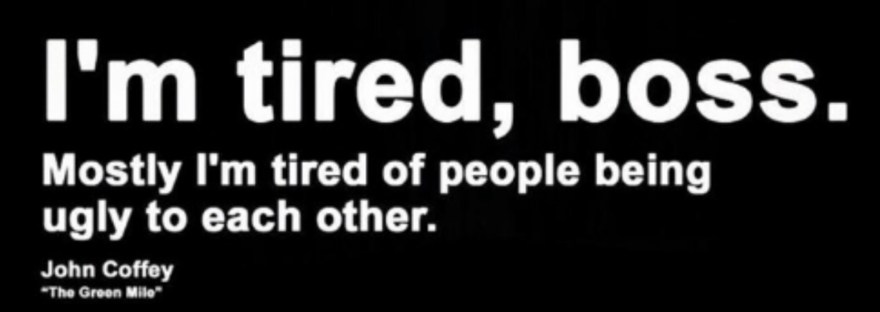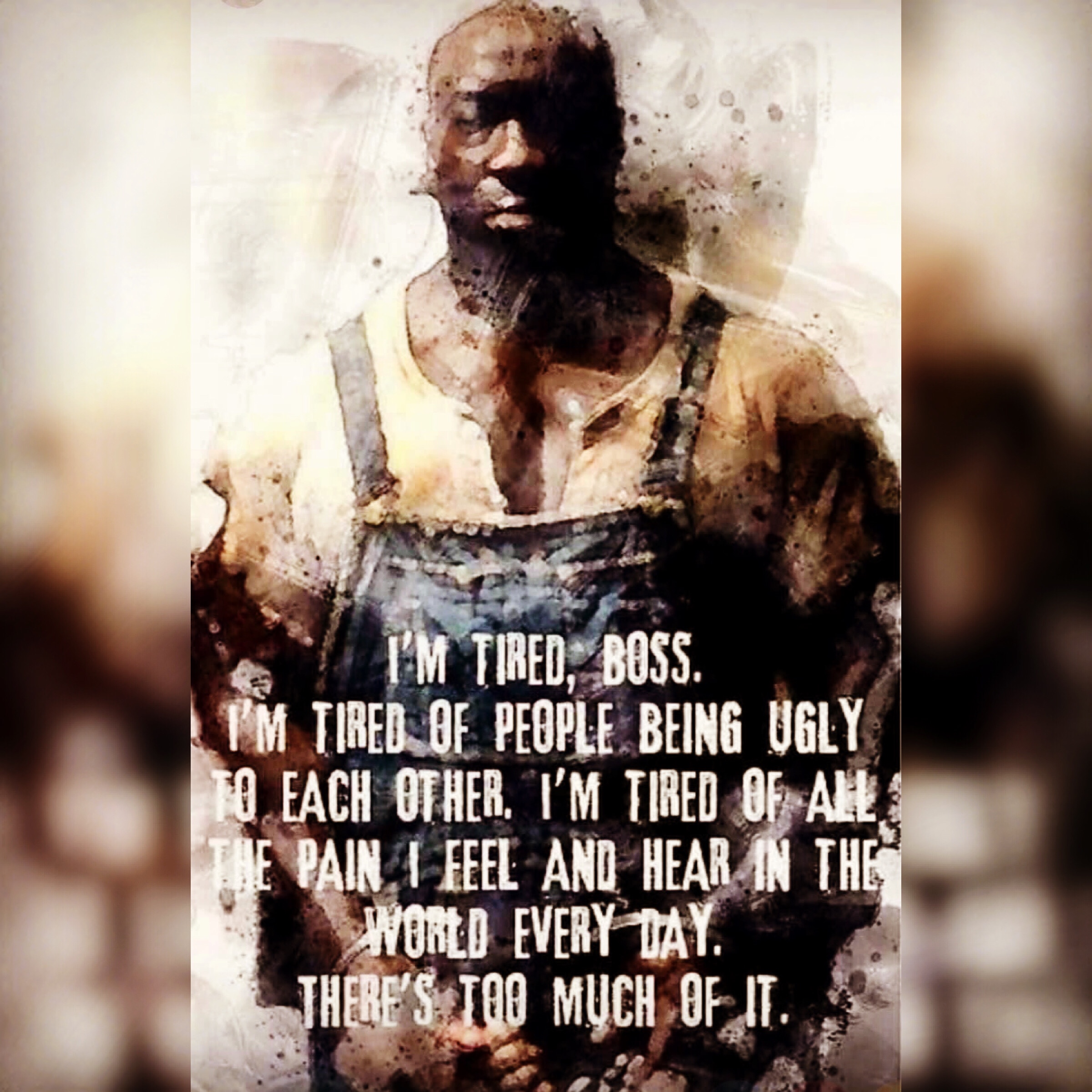 I’m tired, boss. Tired of being on the road, lonely as a sparrow in the rain. I’m tired of never having me a buddy to be with to tell me where we’s going to, coming from, or why. Mostly, I’m tired of people being ugly to each other. I’m tired of all the pain I feel and hear in the world … every day. There’s too much of it. It’s like pieces of glass in my head … all the time. Can you understand?