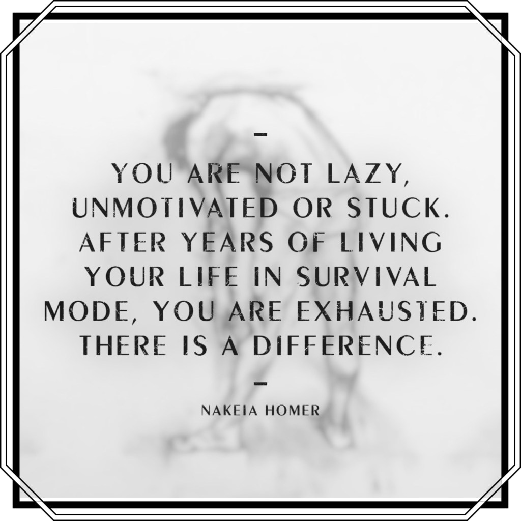 The timeline for recovering from psychological and emotional exhaustion is neither fluid OR the same process for everyone. The grieving and mourning period for the you that was lost in the boxing ring of life is YOURS to spend and no one gets to tell you when you “should” be over anything or that you’re just fuckin’ LAZY for licking your wounds!