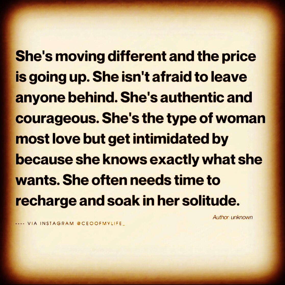 You’re moving different and your price is going up. You AREN’T afraid to leave anyone behind. You ARE authentic and courageous. You ARE the type of human being most love but get intimidated by because you know EXACTLY what you want. Take some time for YOU today to recharge and soak in the glorious solitude of YOU!
