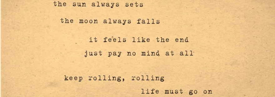 Sitting alone in the cold of the night. You’re trying to find what you need to survive. You’re so afraid you can’t go on. Left in the silence that tears at your heart. They only remind you how broken you are. You’ve lost your way. But hope is not gone, ’cause The Sun always sets, The Moon always falls. It feels like the end – just pay no mind at all. Keep rolling … rolling … Life must go on. Do you remember and long for the past? When love was eternal and joy seemed to last. Yesterday. Forever is gone. We have our misfortunes – the darkest of days. We must endure and keep strong. Just look to the morning … the promise awaits … and know that this life must go on. And the Sun always sets. The Moon always falls. It feels like the end – just pay no mind at all. Keep rolling … rolling … Life must go on. {Alter Bridge}