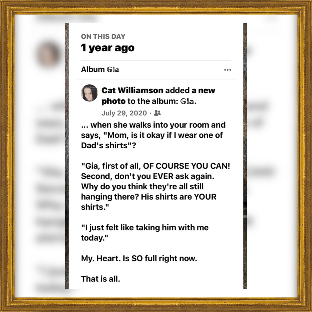 I’m not sure if any sentence in my life has ever impacted me as much as this one. As I’ve said before, there are less than two handfuls of people who know what Gia really went through with Zack’s suicide and preceding insanity. The mere fact that she has been able to make peace with not only his death, but the actual demon that was living in his mind that hurt us both beyond fathom in the end is literally mind-numbing. At this point in the process, she has forgiven him for everything, talks about him incessantly, and still correlates him to every best part of her life and childhood.