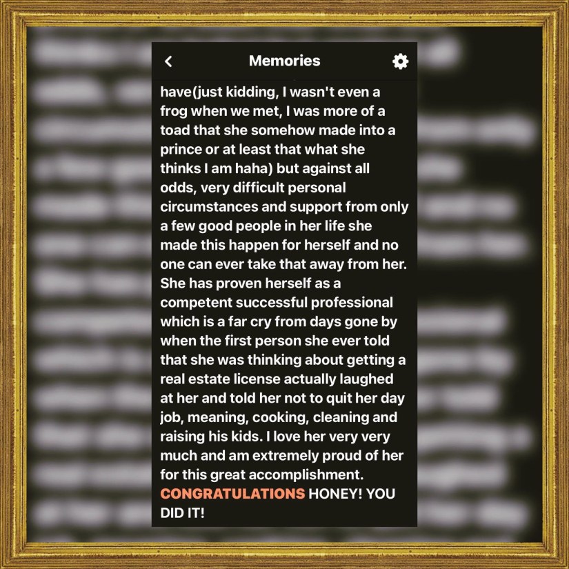 I’m proud of myself right now for seeing this “memory” today and not shedding a single tear. Rather, all I could do is smile with pride, because after all was said and done, and although at first I couldn’t see the me he saw on those days he’d FORCE me to look at myself in a mirror and try to see myself through his eyes, I see her loud and fucking clear these days not only every time I HAPPILY look into a mirror, but even more so when I look at my kids. They are my legacy. They are the reason he fought so hard for me to make peace with my own reflection.