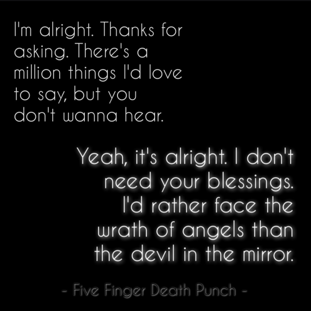 ‘Cause I’m alright. Thanks for asking. There’s a million things I’d love to say, but you don’t wanna hear. Yeah, it’s alright. I don’t need your blessings. I’d rather face the wrath of angels than the devil in the mirror. I don’t think God is listening. She told us to follow, but left us behind. I’ve never seen an angel, but I know the Devil, and he told me I’m fine. “What doesn’t kill you will only make you stronger.” That’s what everyone keeps telling me. I’d rather capsize than chase an old horizon. Throw me back into the deadest of seas. I know that God is laughing. She gave us our wings, but never taught us to fly. They say the end is coming, and if that’s true, well, I don’t think I mind. Heaven or hell? I can’t tell which is which. I always knew it would come to this. Roll, roll, roll … I’m movin’ ahead. Roll, roll, roll … guess I’ll sleep when I’m dead. {Five Finger Death Punch}