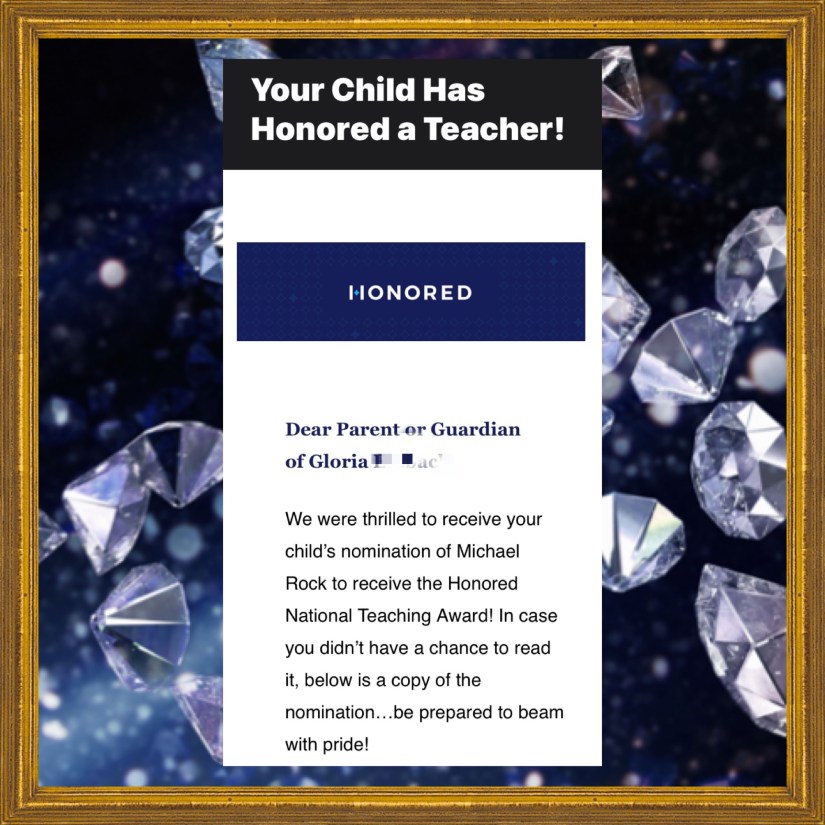 Take for instance this email I got today amidst an actual storm that was brewing in the atmosphere about something Gia had written to recognize and nominate one of her favorite teachers for an “Honored” teaching award: