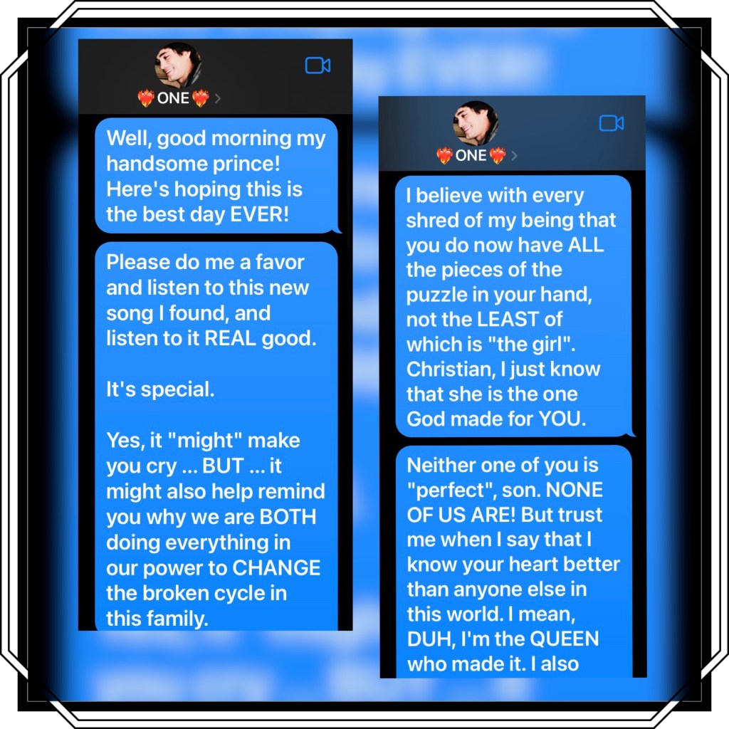 I believe with every shred of my being that you do now have ALL the pieces of the puzzle in your hand, not the LEAST of which is “the girl”. Christian, I just know that she is the one God made for YOU. Neither one of you is “perfect”, son. NONE OF US ARE! But trust me when I say that I know your heart better than anyone else in this world. I mean, DUH, I’m the QUEEN who made it. I also know how that vast wonderland of a mind of yours works, too. IT’S JUST LIKE MINE! That’s how I KNOW that you two were made “perfect for EACH OTHER”.