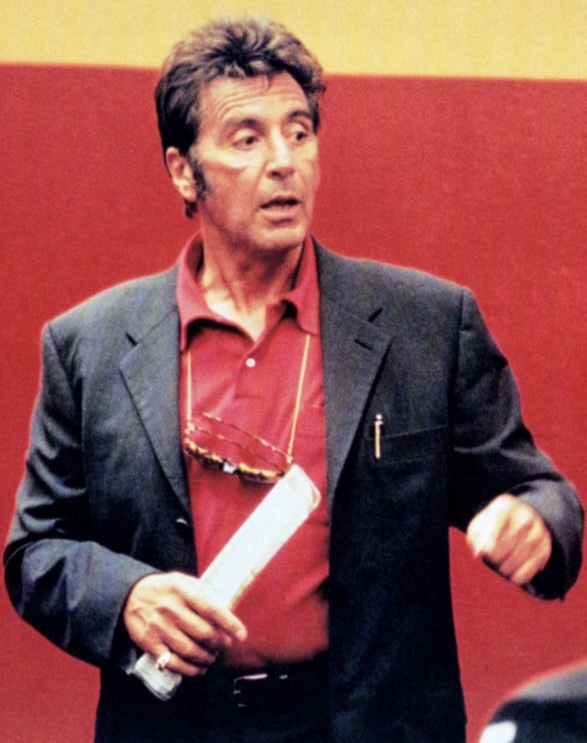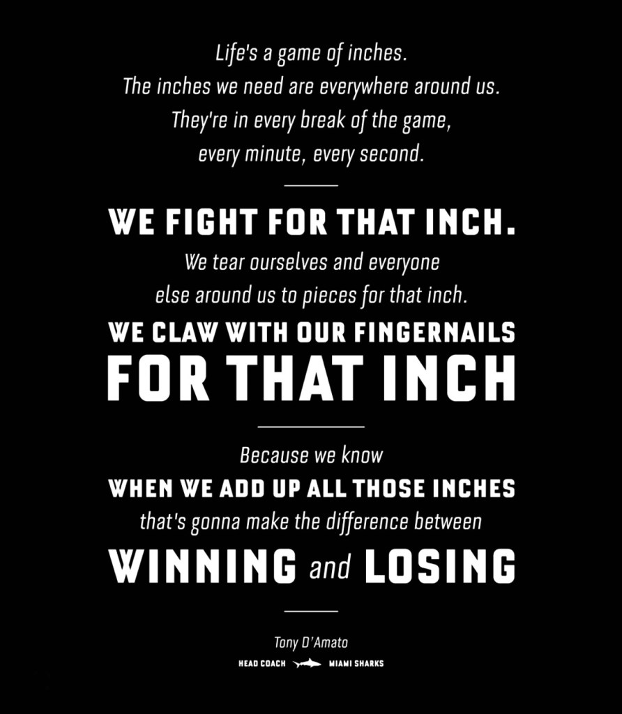 I don’t know what to say really. Three minutes to the biggest battle of our professional lives all comes down to today. Either we heal as a team or we’re gonna to crumble … inch by inch … play by play … ’til we’re finished. We are in hell right now, gentlemen, believe me. And, we can stay here and get the shit kicked out of us, or, we can fight our way back into the light. We can climb out of hell … one inch at a time. Now, I can’t do it for you. I’m too old. I look around – I see these young faces, and I think … I mean … I made every wrong choice a middle age man could make. I, uh, I pissed away all my money, believe it or not. I chased off anyone who’s ever loved me. And lately, I can’t even stand the face I see in the mirror. You know, when you get old in life, things get taken from you. That’s … that’s … that’s part of life. But, you only learn that when you start losing stuff. You find out life’s this game of inches. So is football. Because in either game – life or football – the margin for error is so small. I mean … one half step too late or too early … you don’t quite make it. One half second too slow or too fast and you don’t quite catch it. The inches we need are everywhere around us. They’re in every break of the game … every minute … every second. On this team, we fight for that inch. On this team, we tear ourselves and everyone around us to pieces for that inch. We CLAW with our fingernails for that inch, ’cause we know when we add up all those inches that’s going to make the fucking difference between WINNING and LOSING … between LIVING and DYING. I’ll tell you this … in any fight, it is the guy who is willing to die who is going to win that inch. And I know if I am going to have any life anymore, it is because I am still willing to fight, and die for that inch … because that is what LIVING is. The six inches in front of your face. Now, I can’t make you do it. You gotta look at the guy next to you … look into his eyes! Now, I think you are going to see a guy who will go that inch with you. You are going to see a guy who will sacrifice himself for this team because he knows when it comes down to it, you are gonna do the same thing for him. That’s a team, gentlemen, and either we heal now, as a team, or we will die as individuals. That’s football, guys. That’s all it is. Now, whatta you gonna do?