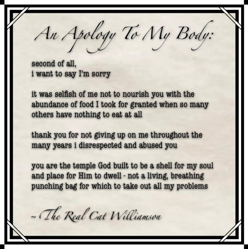 … and, with that, how dare I have disrespected, abused, and punished this healthy body that the good Lord gave me and treated it as a punching bag on which to take out all my anger, sadness, and inner turmoil? It was my soul that that had been empty for more than 19 years in a row, not my stomach. It was my soul that needed to be fed the truth, silence, forgiveness, and acceptance it had been starving for all the while. Thank you, GOD, and thank you to MY BODY, that I was given the chance to atone and account for all the damage I had done to the beautiful, HEALTHY shell that I’d been desecrating.