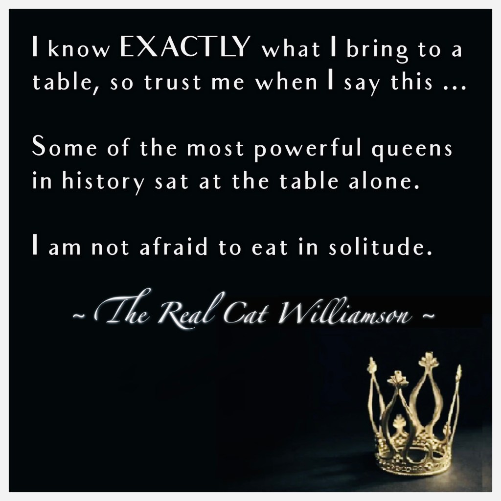 They say that the most dangerous people in the world are the ones who aren’t afraid to eat alone. Well, “they” are fuckin’ geniuses! I’m a risen from ASHES living queen, my friends, and yes, sometimes a queen HAS to sit at the table alone when her king has left the castle either temporarily or, in my case, abdicated it permanently. But you see, it’s how we sit “alone at our table” that defines us. As for me? I shall not be laying waste to a single one of my hard-earned Golden Years.