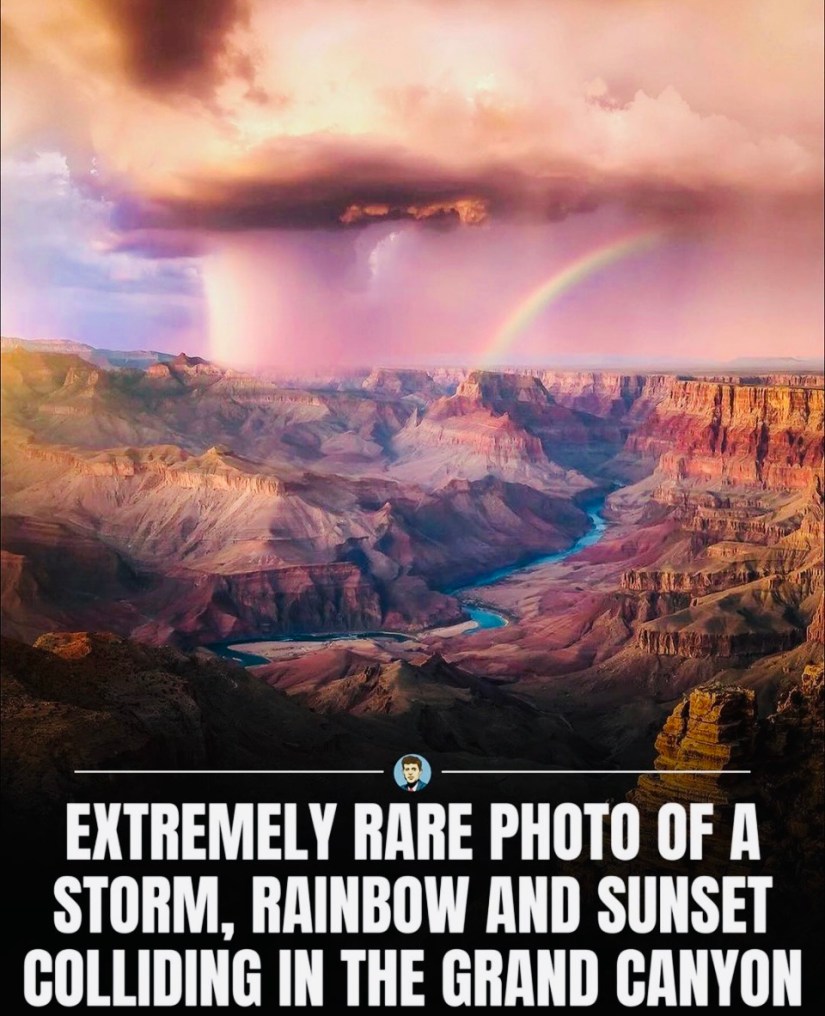 … what it looks like when a storm, rainbow and sunset collide in the Grand Canyon. The Grand Canyon provides a unique setting for the formation of rainbows due to its immense size and the presence of water particles in the air. When rain showers pass through the canyon, the sunlight interacts with the water droplets, resulting in the creation of stunning rainbows.