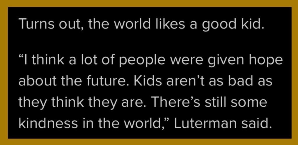 With that, yes, I really am now following her journey. So should we all. Do me a favor, please, and find and follow any of her pages on social media and support her journey to break that world record. I truly believe she deserves it, because that kind of beautiful infection and “powered by grace” selflessness in a world chock full of what can often be miserable excuses for young adults is rare. Just sayin’!