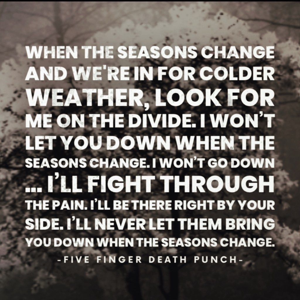 When the seasons change and we’re in for colder weather I won’t let you down when the seasons change. I won’t go down. I’ll fight through the pain. I’ll be there right by your side. I’ll never let them bring you down when the seasons change.