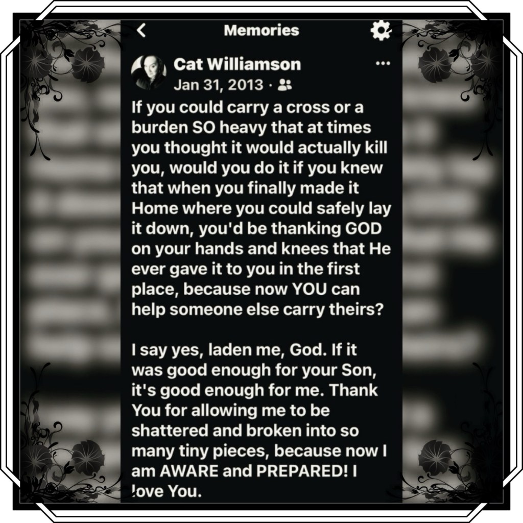 If you could carry a cross or a burden SO heavy at times that you thought it would actually kill you, would you do it if you knew that when you finally made it home where you could safely lay it down, you’d be thanking GOD on your hands and knees that He ever gave it to you in the first place, because now YOU can help someone else carry theirs? I say yes, laden me, God. If it was good enough for your Son, it’s good enough for me. Thank You for allowing me to be shattered and broken into so many tiny pieces, because now I am AWARE and PREPARED! I love You.