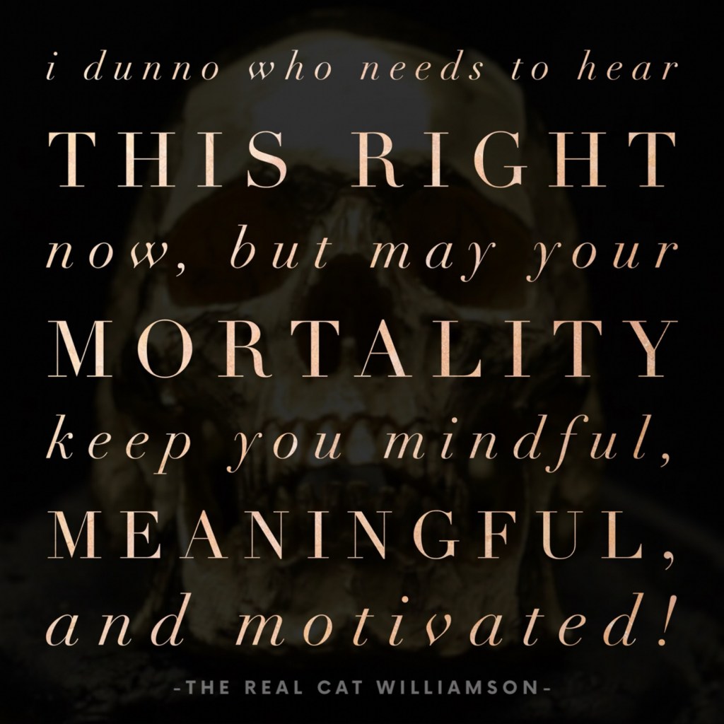 … and thus another 365 days are now waiting ahead to take us ALL back around the The Sun again, God willing. To know me well is to know that I am TRULY in love with every minute of every day that I “get” to partake in this bittersweet, beautiful, shit show of a fucking CIRCUS we call life. Some may find me morbid, macabre, pessimistic, “doom and gloom”, or obsessed with the thought of Death. I am not. Quite the contrary, actually – BUT – i AM a stoic … AND a realist … and if dancing with “Death” has gifted me anything, it’s my absolute peace with death and understanding about the brevity of mere existence. So, with that, as you begin what will hopefully prove to be YOUR next beautiful trip around our fiery girl in the sky … “MEMENTO MORI”: Remember that you have to die! Let my words and my story be a sobering, LIFElong reminder to make each of the 86,400 seconds of your next 365 days REALLY count. Live today, not tomorrow, because unless you’re God or an immortal jellyfish, tomorrow isn’t promised. “… and if you see me losing faith in what it means to die, don’t let me leave before I know what lies behind the stained-glass doors. Save sorrow for the souls in doubt. Bleed every care out.