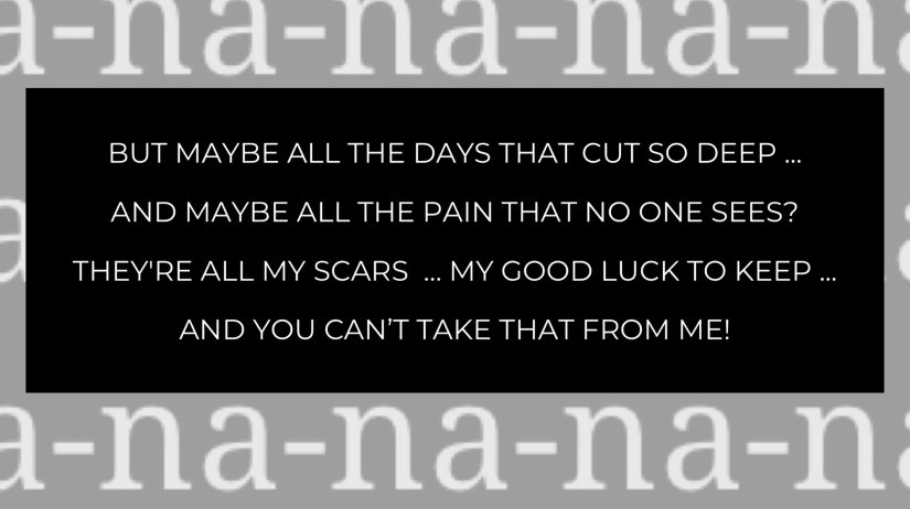 “But maybe all the days that cut so deep … and maybe all the pain that no one sees? They’re all my scars, my GOOD luck to keep … and you can’t take that from me!”