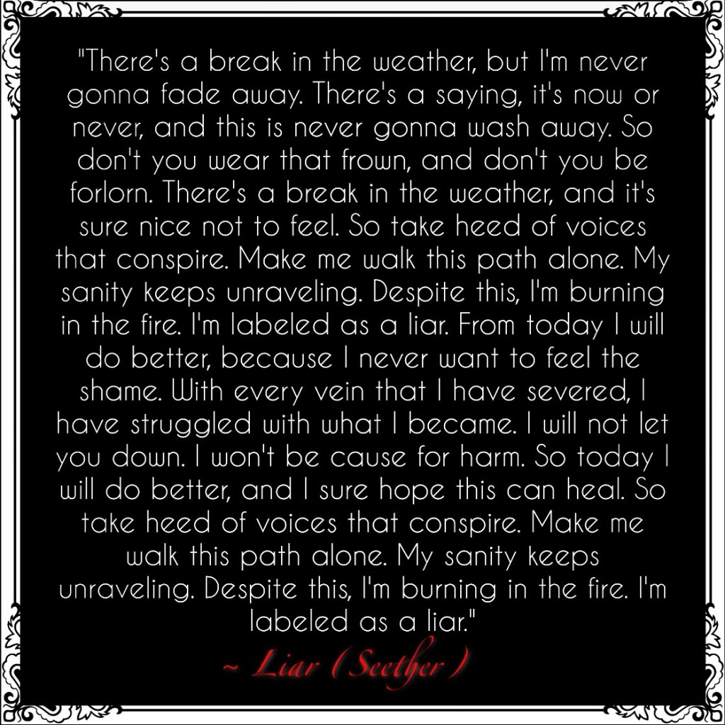 Fight the fight alone when the world is full of victims. Dims a fading light in our souls. Leave the peace alone. Now we all are slowly changing. Dims a fading light in our souls. In my opinion seeing is to know. The things we hold are always first to go. And who’s to say we won’t end up alone? On broken wings I’m falling, and it won’t be long. The skin on me is burning by the fires of the Sun. On skinned knees I’m bleeding, and it won’t be long. I’ve got to find that meaning, and I’ll search for so long. Cry ourselves to sleep. We will sleep alone forever. Will you lay me down in the same place with all I love? Mend the broken homes. Care for them, they are our brothers. Save the fading light in our souls. In my opinion seeing is to know. What you give will always carry you. And who’s to say we won’t survive it too? I’ll search for so long. We’ll set a-free all relying on their will to make me all that I am and all I’ll be. We’ll set a-free all who’ll fall between the cracks with memories of all that I am. {Alter Bridge}