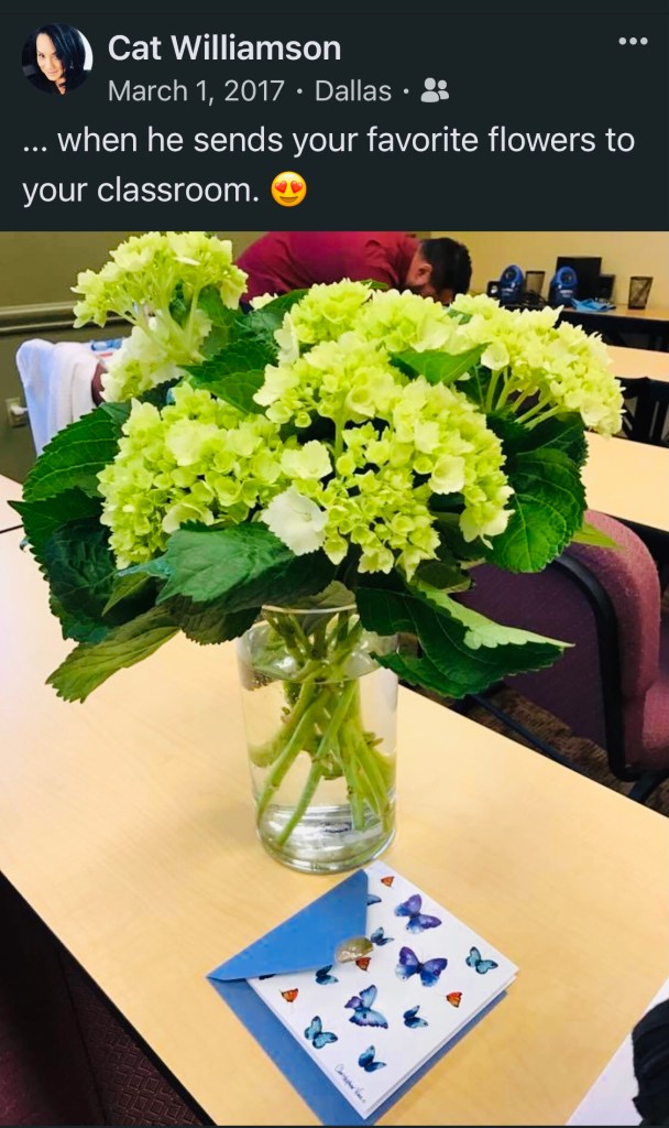 THE FLOWERS! It was one of my favorite things about him. He’d send me flowers even when I wasn’t home, whether I was sitting in a classroom somewhere, or on the rare occasion that I traveled without him, they’d be waiting in my hotel room!