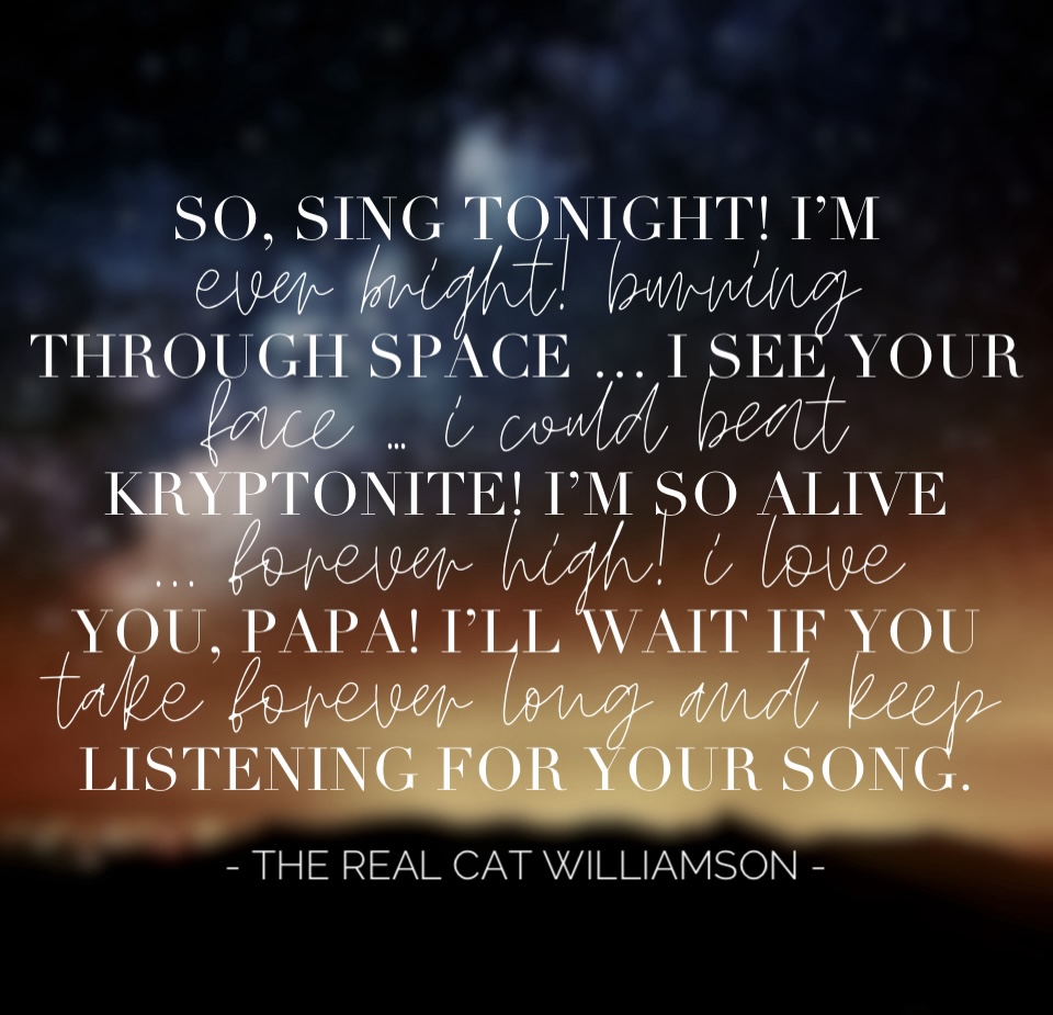 Beautiful new frontier! High above the rain in the atmosphere … what wonders I have discovered! My soul is ever clear. Never felt the way I do with You here. I hope there’s never another. So, sing tonight! I’m ever bright! Burning through space … I see Your face … I could beat kryptonite! I’m so alive, forever high! I love You, Papa! I’ll wait if You take forever long and keep listening for Your song.