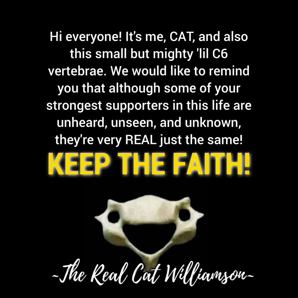 Mmmkay? MMMKAY! Yes, it’s “August 8th“, and although the mental pictures in my head about this day five years ago could try to bring me to my knees, that devil that so desperately wants to keep me hostage to them still doesn’t seem to know what I know: I am loved! I am supported! I am the favorite daughter of a GOD who IS my C6 and therefore never “all alone”! Nothing is going to steal The Sun from my sky today or take my “Power + Grace“, and NOTHING is going to eclipse the memory of the smiling face of one of the most beautiful human souls I’ve ever known, sad as he may truly have been that night. Bye everyone, it’s me, CAT, and my tiny but mighty ‘lil vertebrae! If I can do this, YOU can do this!