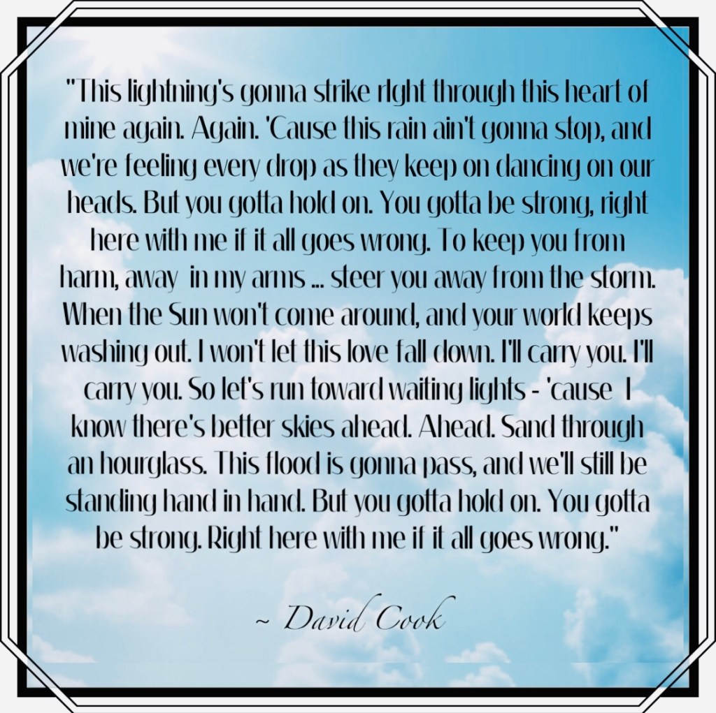 This lightning’s gonna strike right through those hearts of yours again, ’cause this rain ain’t gonna stop, and you’ll feel every drop as they keep on dancing on your heads. But you gotta hold on … you gotta be strong … right here with me if it all goes wrong to keep you from harm … away in my arms … steer you away from the storm! When The Sun won’t come around and your world keeps washing out, I won’t let this love fall down. I’ll carry you. So, let’s run toward waiting lights, ’cause I know there’s better skies ahead. Sands through an hourglass … your floods are gonna pass … and we’ll still be standing, hand in hand!