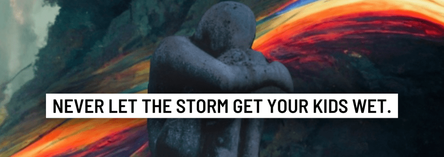 I once read a quote that said, “Never let your storm get your kids wet”. Well, this is me after finally forcing myself to SIT in the storm I rained upon the two people in the world I was charged to protect the most in a shirt dripping with tears of guilt and shame. Yes, I’ve forgiven myself for my many failures as a mother. Yes, I believe they’ve forgiven me, too. Nevertheless, if there’s just one song that’s meant to be a poignant reminder of what we’ve all been through together, then so be it. Pray God that my babies’ babies won’t, too, be sitting atop a faded rainbow of their own one day in my irrepressible shirt and that this season of change holds steady.